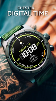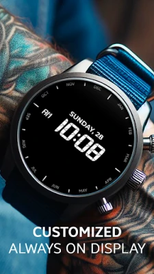 Digital watch face for Wear OS, with many settings and information displayed.