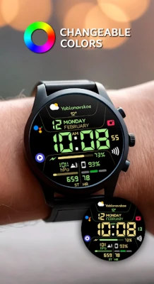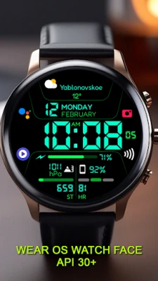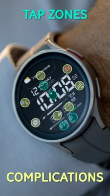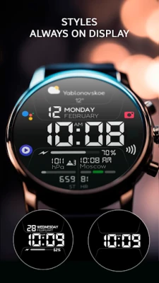 Main functions: - Zones for selecting applications for quick access. - Zones to display selected information. - 30 colors. - Three AOD modes. - Multilingual.