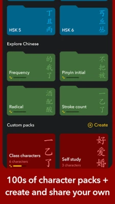 ✓ Create your own packs by searching for characters by Pinyin. You can even mix Pinyin, English and Chinese characters in one search to find as many results as possible, and one tap adds them all to your custom pack.