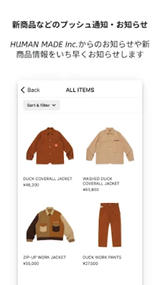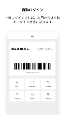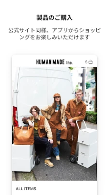HUMAN MADE Inc.公式アプリでは、HUMAN MADE直営店舗やONLINE STOREとシームレスにつながる会員証、NEWSや新商品情報がいち早く届くプッシュ通知、気に入ったアイテムをリストで管理できるお気に入り登録など、便利な機能がご利用いただけます。ぜひ、アプリでのショッピングをお楽しみください。