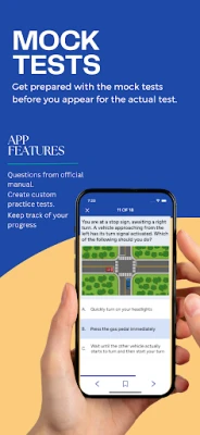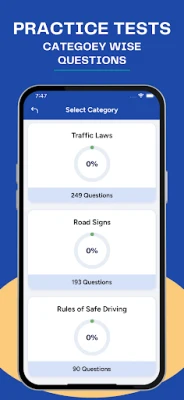 The app includes a practice module that allows to get familiar with questions that fall under different categories like Traffic Rules, Road Signs and Rules of Safe driving. It also keeps track of the progress you have made in each category. It contains questions from following categories: